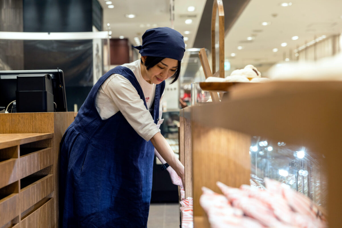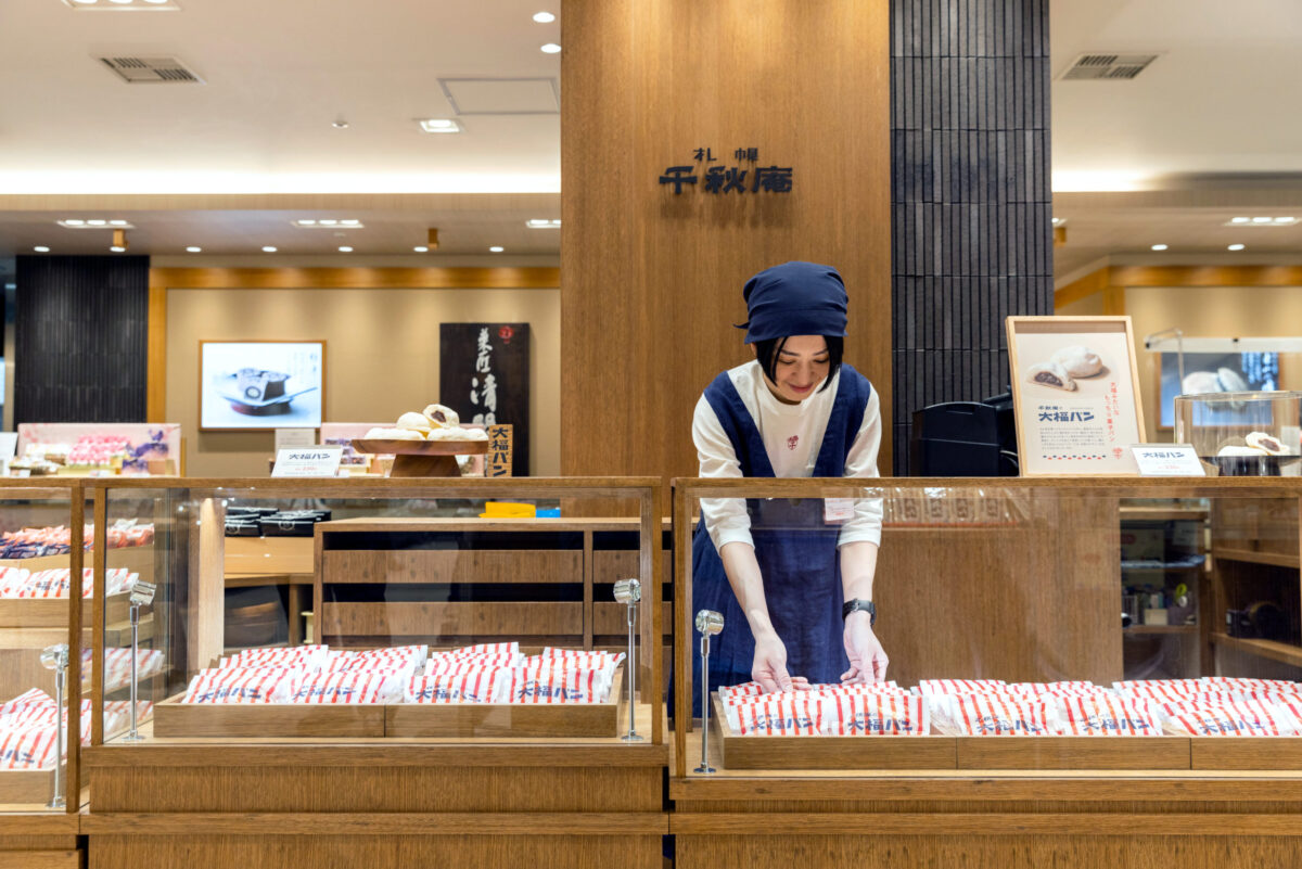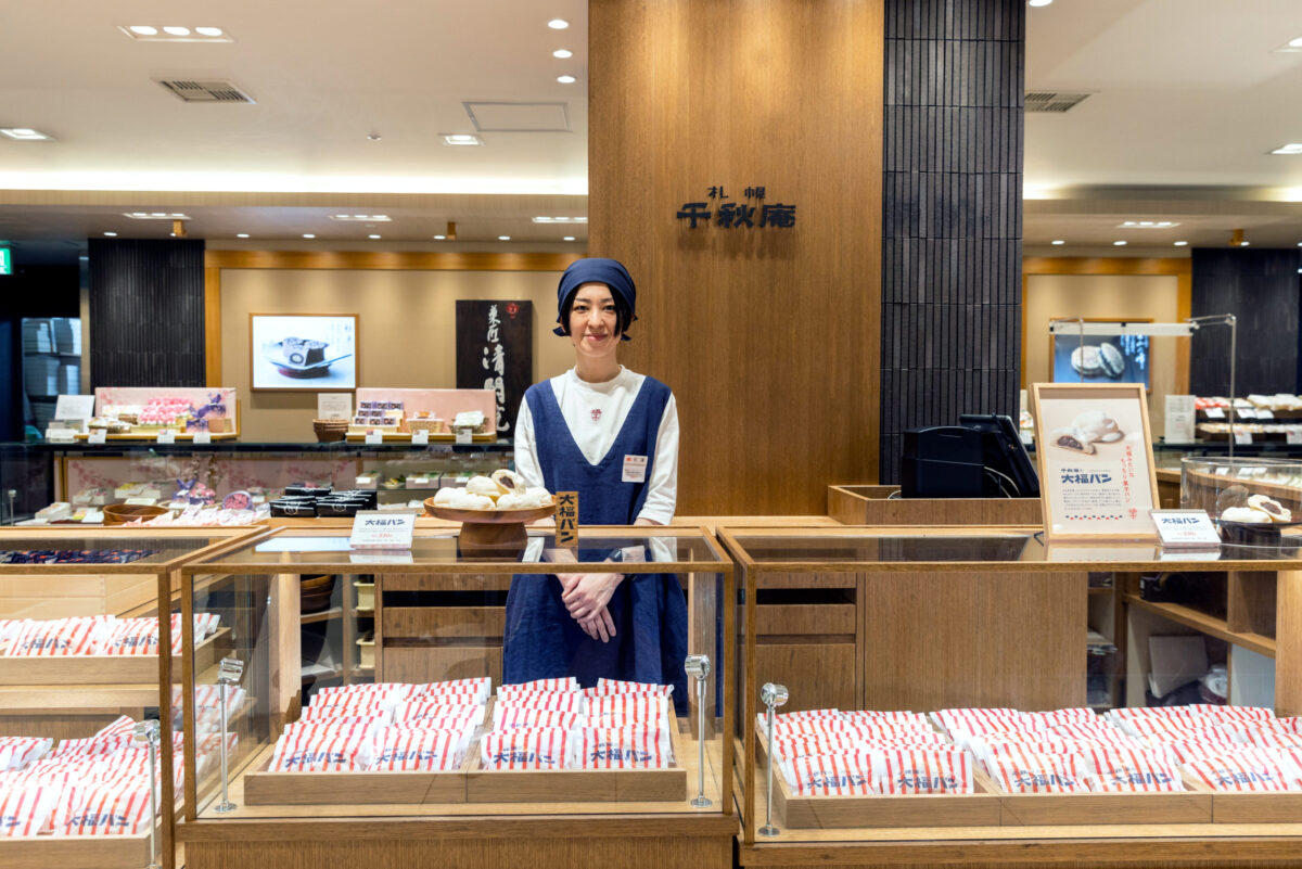 販売カウンターは昔ながらの対面販売の温かみを感じさせるオリジナルの木製什器をデザイン。大福をモチーフにした半円状のデザインにより、和の中にも現代的な洋を感じる雰囲気を感じる雰囲気を演出しています。また、「山親爺」や「ノースマン」など千秋庵を代表するお菓子も販売。 千秋庵が昔から街に灯してきたものづくりの気持ちと伝統を、空間とデザインに込めています。