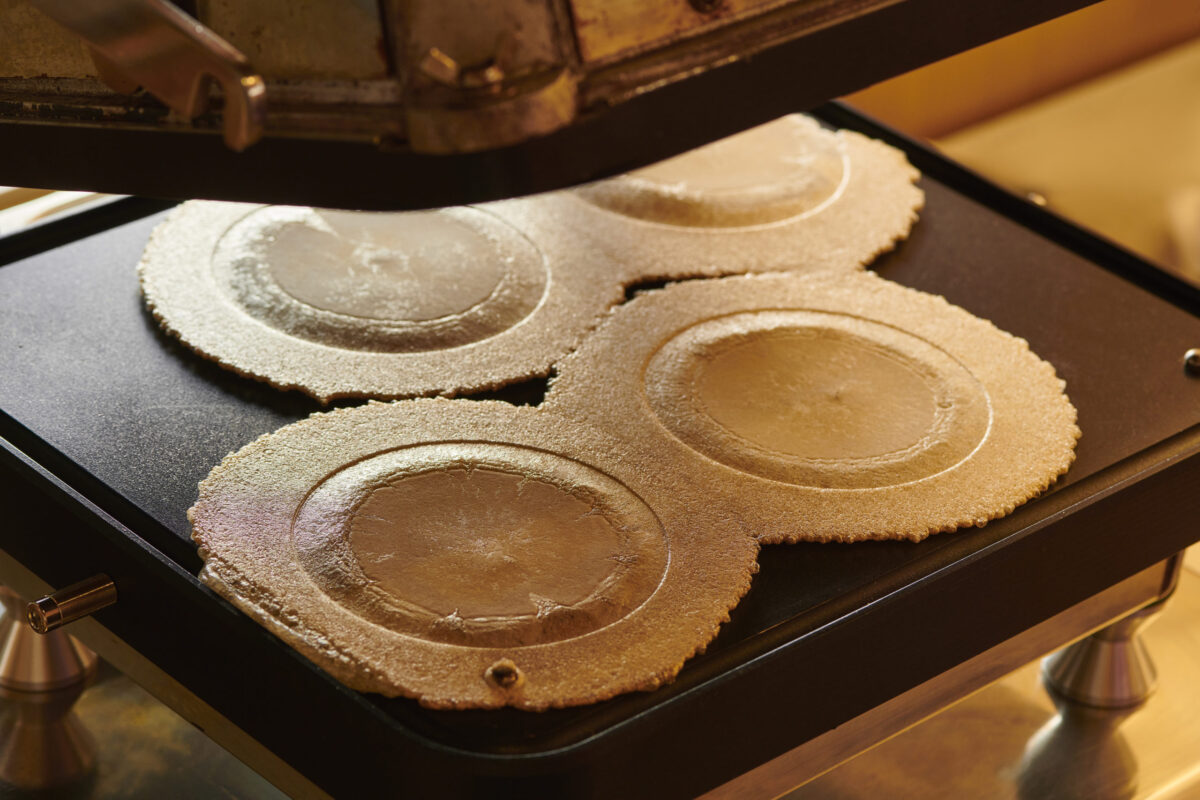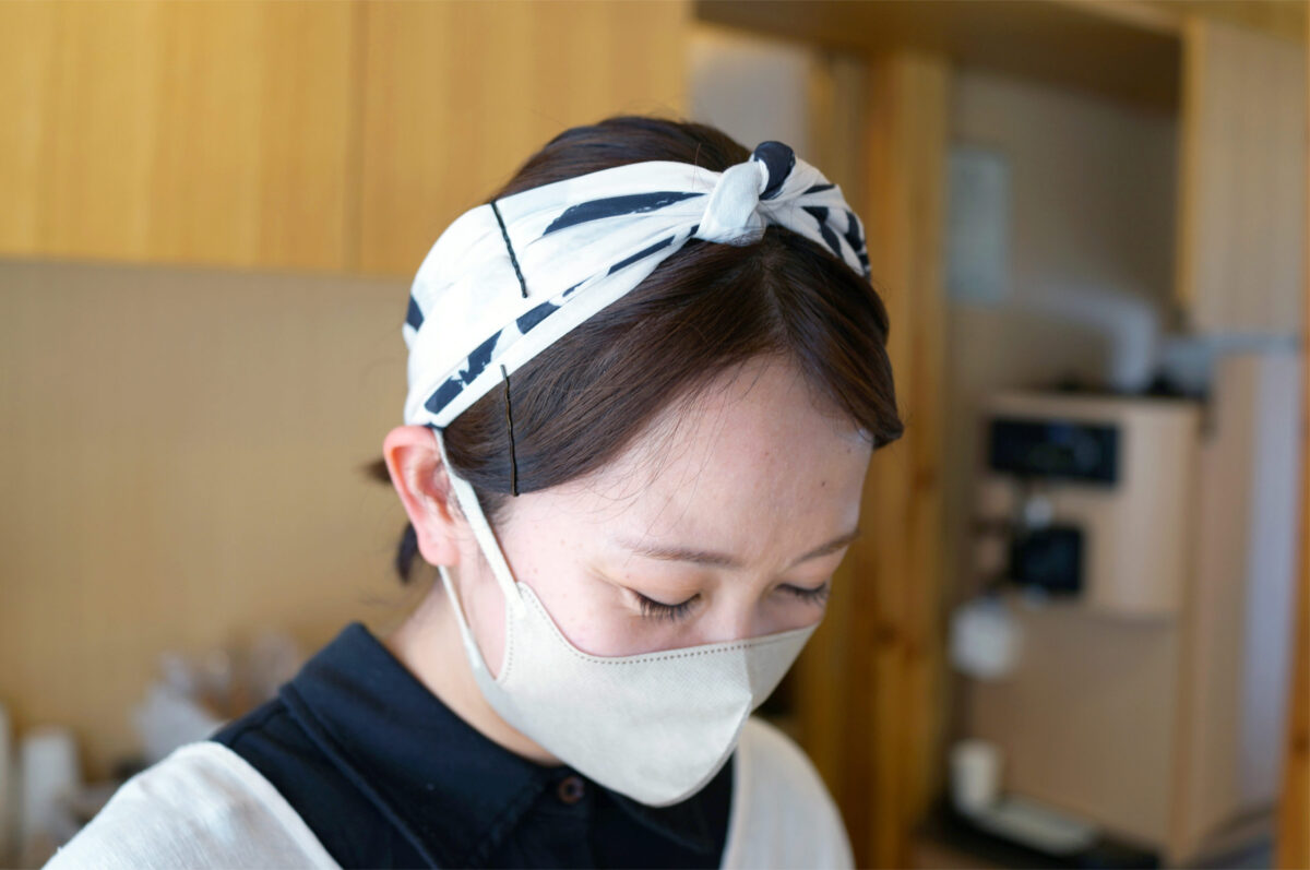 作業性や見た目を重視しつつも、丁寧な手仕事や神宮茶屋という特別な場での佇まいを考慮し、和を感じるリネン素材の着物割烹着をベースにユニフォームとしてコーディネート。また、暖簾などのビジュアルに合わせたオリジナルバンダナをデザインし、ブランドのトーンに合わせたアイテムを纏うことで、本格感のある仕上がりに。