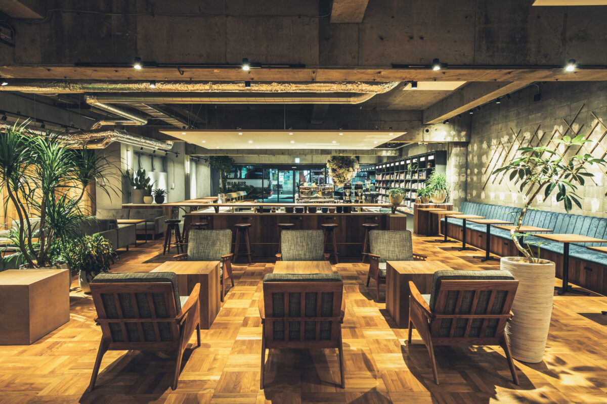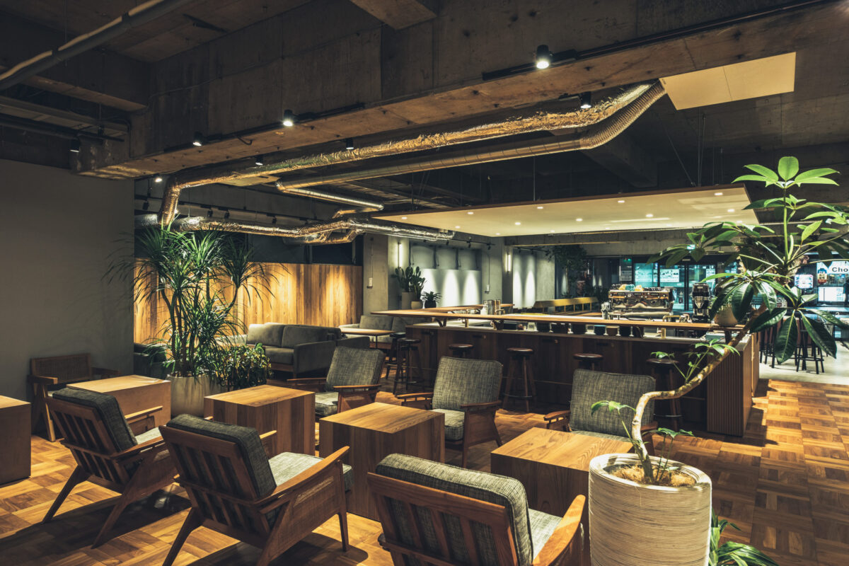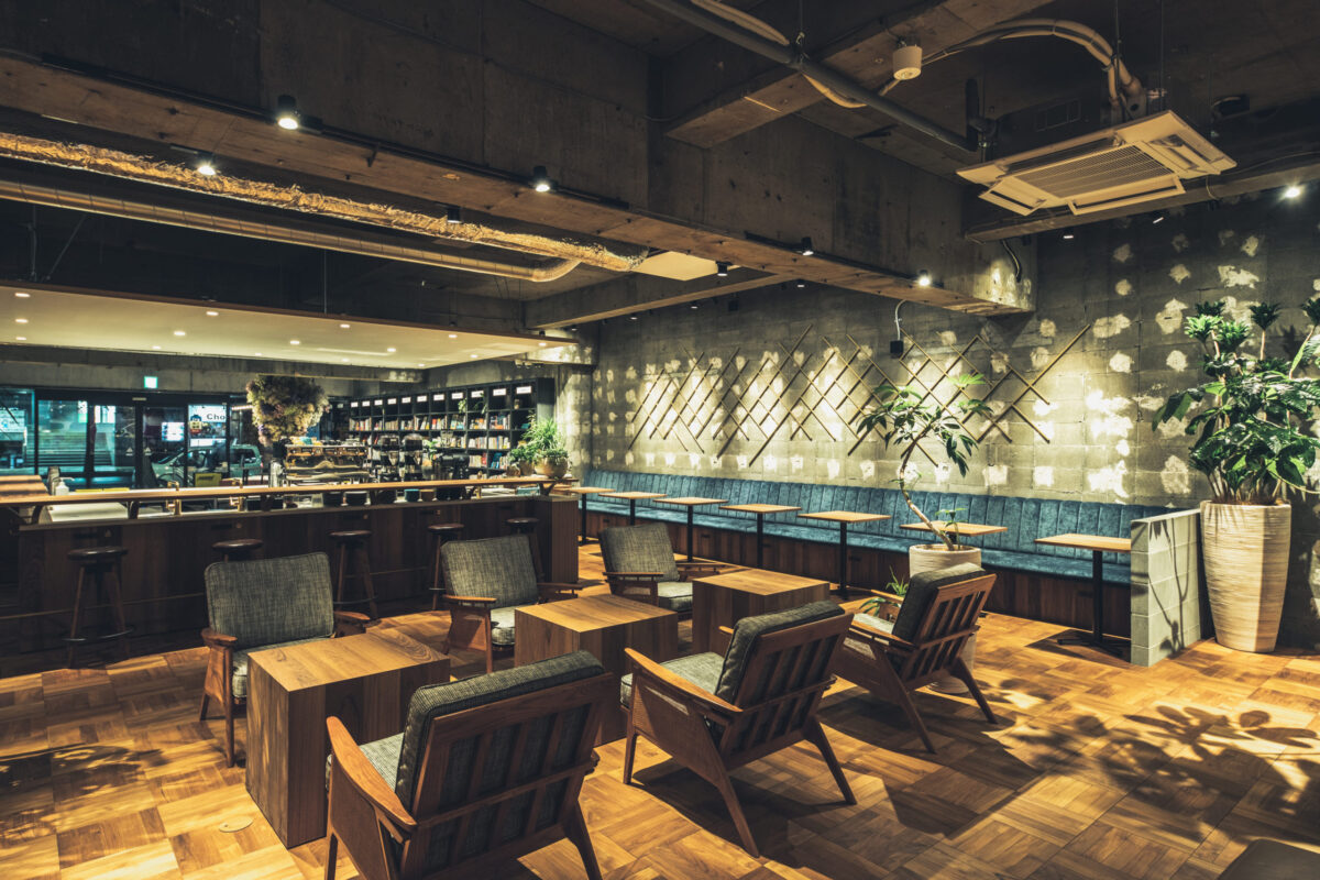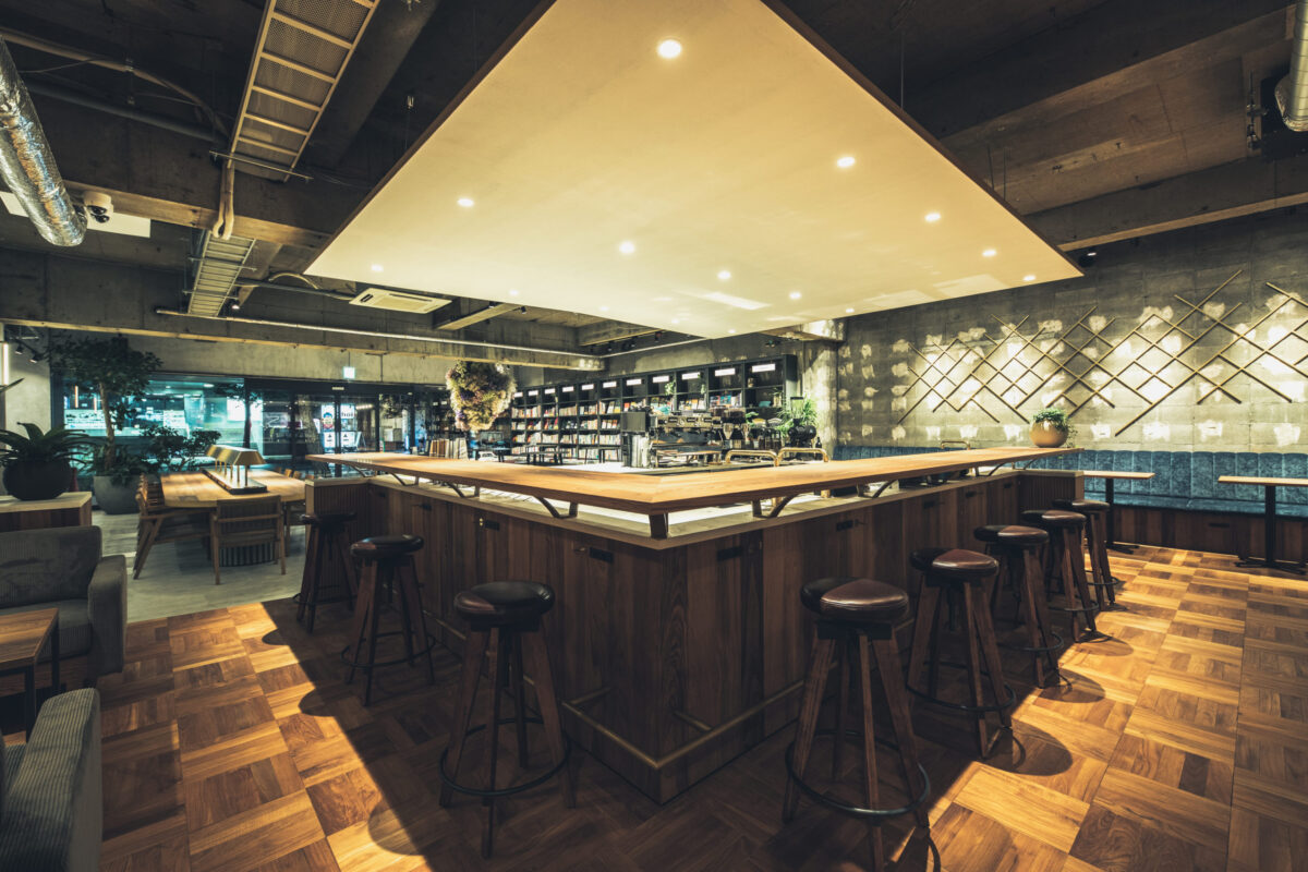 コワーキング、カフェ、書店と様々な側面を持つが、 壁を作らずゾーン分けし、中央に据えたカフェカウンターを 各ゾーンを緩やかに繋ぐハブとして機能させ、 カウンターにいるスタッフが全体を見渡せる構成とした。 仕事をする人、打ち合わせをしている人、コーヒーを飲む人、本を読む人など、 その行動や佇まいもここの空間を彩る要素として捉えた。 木・鉄・レンガ・コンクリートなどをミックスし、 壁面アートやグリーンの色彩も相まって表情豊かな空間となった。 ブランドコンセプトである 「個性をプールして、出会いをループする」 これを体現する場を目指した。
