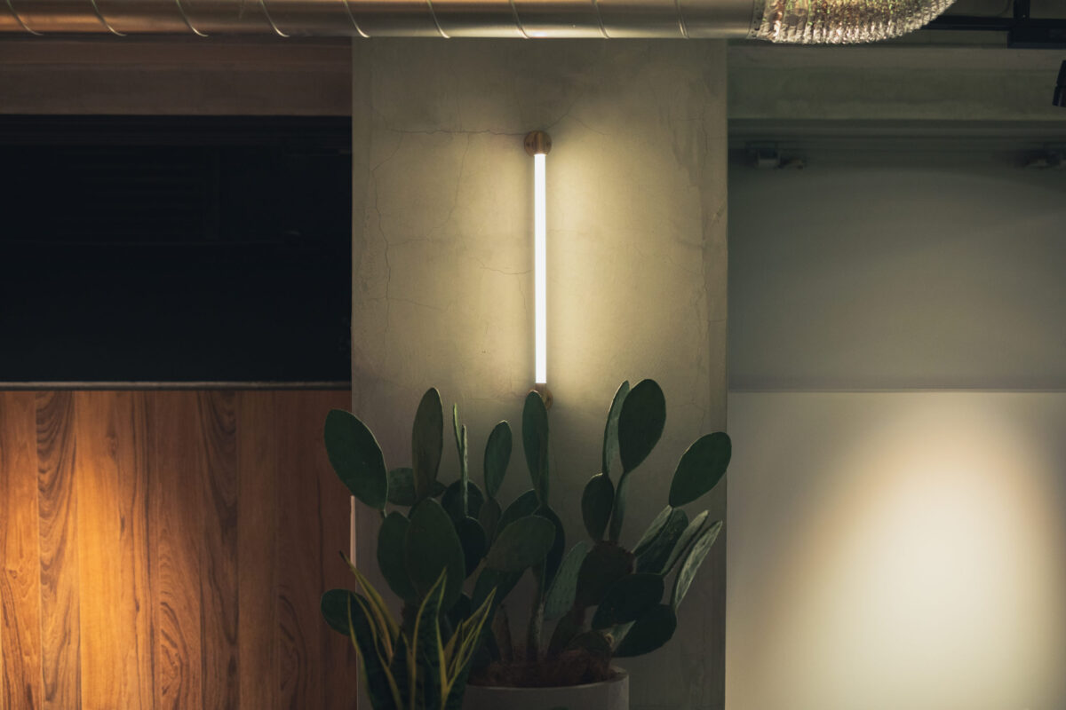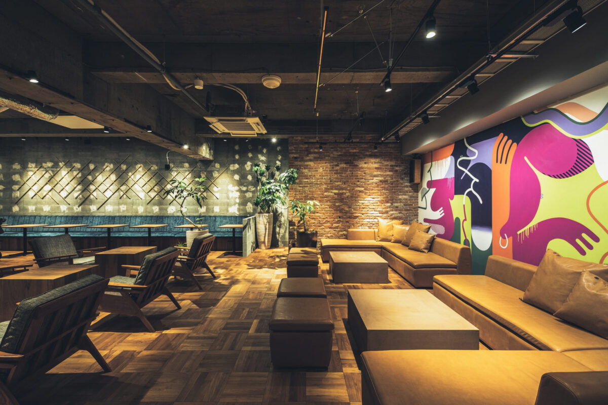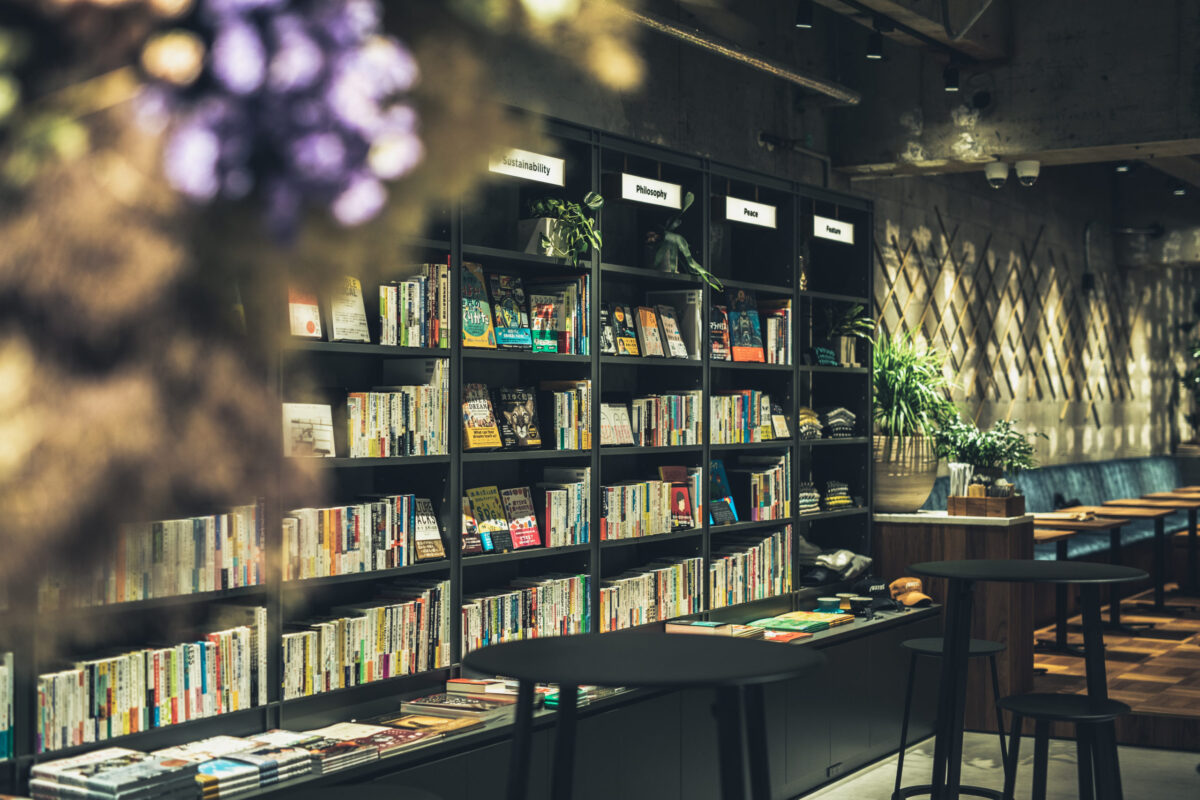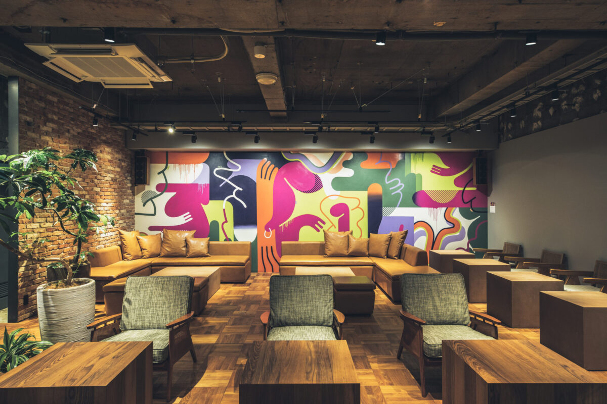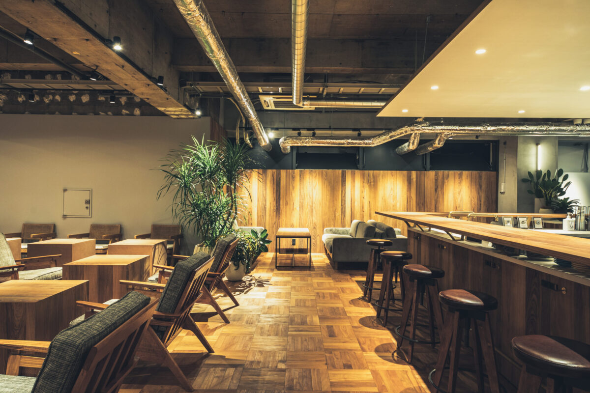 コワーキング、カフェ、書店と様々な側面を持つが、 壁を作らずゾーン分けし、中央に据えたカフェカウンターを 各ゾーンを緩やかに繋ぐハブとして機能させ、 カウンターにいるスタッフが全体を見渡せる構成とした。 仕事をする人、打ち合わせをしている人、コーヒーを飲む人、本を読む人など、 その行動や佇まいもここの空間を彩る要素として捉えた。 木・鉄・レンガ・コンクリートなどをミックスし、 壁面アートやグリーンの色彩も相まって表情豊かな空間となった。 ブランドコンセプトである 「個性をプールして、出会いをループする」 これを体現する場を目指した。