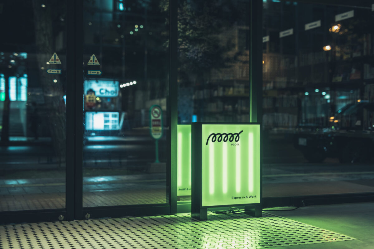 書店を併設したコワーキングカフェ「poool」。人と人、個と個がこの空間で交わりながら繋がり、未来へと進んでいく様子を「poool」の文字が螺旋状に繋がっている形状で表現したロゴデザイン。